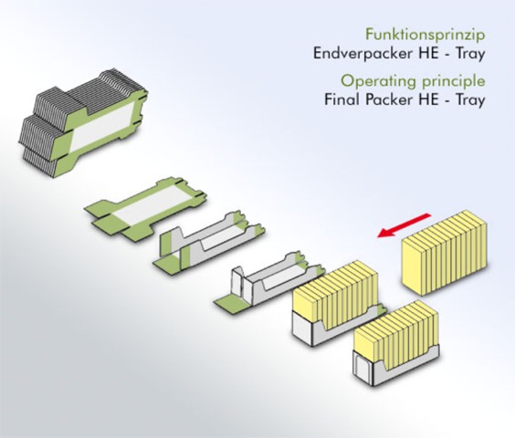 The Dienst HE TL Tray and Lid Packer is a fully automated solution for packing products into corrugated trays. The products to be packaged are accumulated and can be stacked or sorted in any necessary orientation. A tray is then erected from a corrugated blank and the products are then inserted into the tray. The tray is then sealed with glue, and any desired coding is then applied to the finished tray. The HE TL Tray and Lid Packer is the ideal solution for automating your retail-ready packaging.