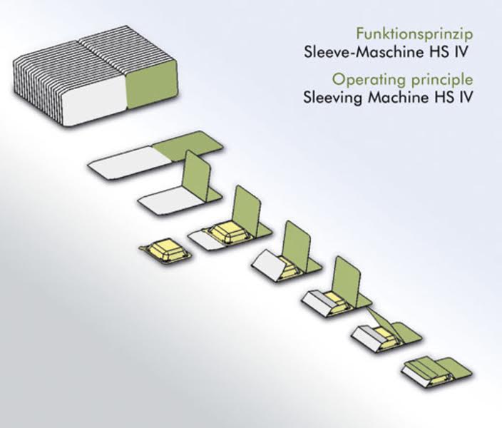The Dienst HS IV S is an automated sleeving system for trays and other retail products that are placed on and wrapped in a paperboard sleeve. Finished products enter the infeed of the HS II S and are placed onto the sleeve blank, which is then folded as needed and sealed with hot-melt glue. The sleeves can additionally be affixed directly to the product with glue, if desired. Featuring intermittent or continuous mode operation at up to 200 units per minute, the HS IV S offers high performance in a reliable, cost-effective unit for unique sleeving applications. Further handling or packaging of finished, sleeved units is also available.